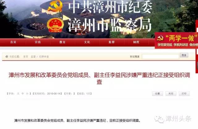 漳州頭條從中共漳州市紀(jì)委、漳州市監(jiān)察局網(wǎng)站獲悉,州市紀(jì)委今天早上剛剛權(quán)威發(fā)布,漳州市發(fā)展和改革委員會(huì)黨組成員、副主任李益民涉嫌嚴(yán)重違紀(jì),目前正接受組織調(diào)查。